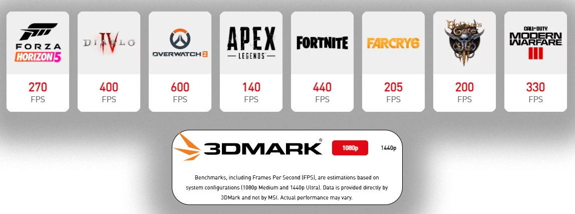Hér fyrir neðan má sjá FPS í mismunandi leikjum í 1080P skjáupplausn. Þessar mælingar eru gerðar án ábyrgðar og í 3DMARK forrritinu og eru niðurstöður teknar af heimasíðu framleiðanda.